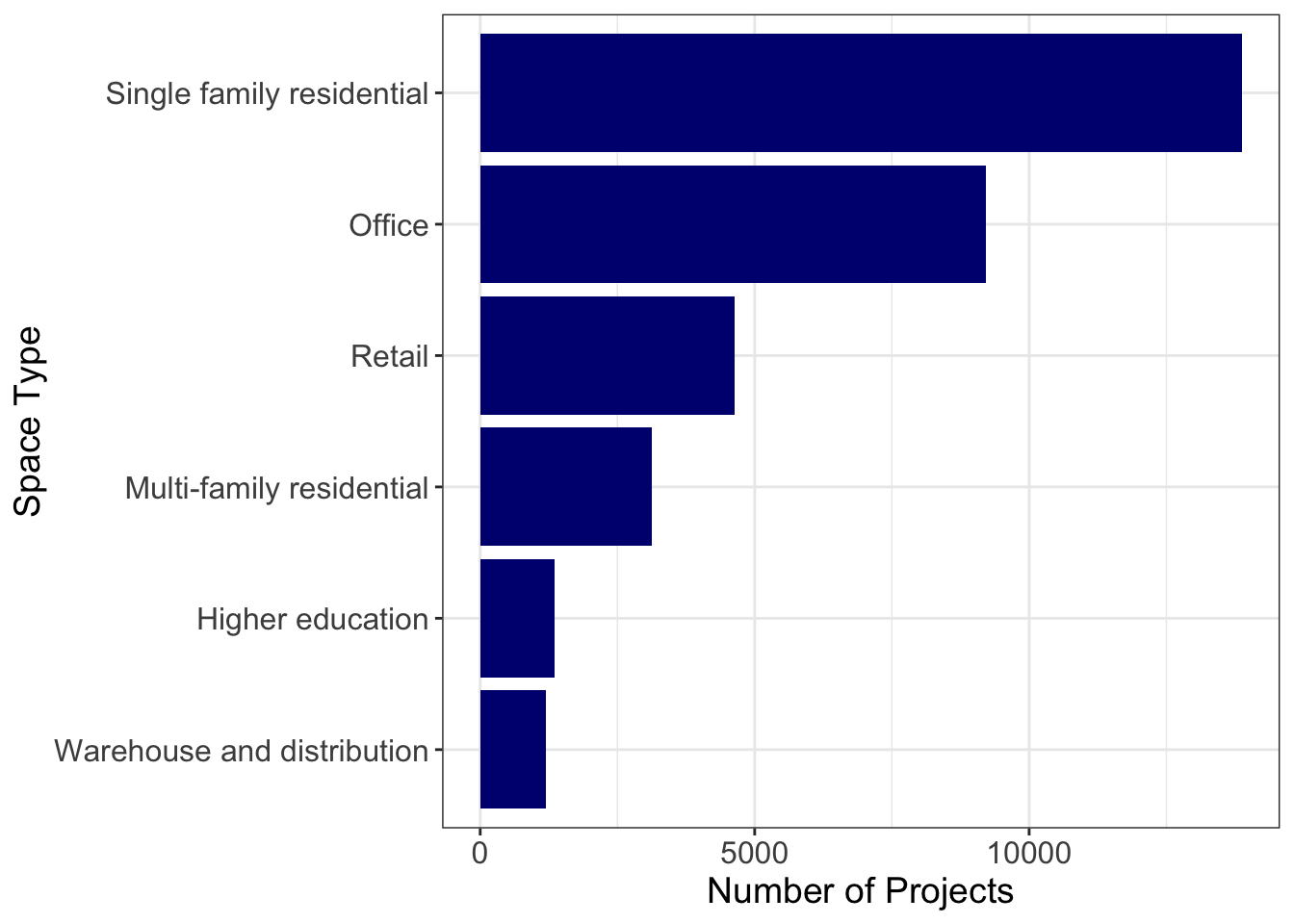 LEED certifies projects of all kinds. A distribution of the number of projects by type over the years 2017-2021 is included in Figure 2.6. There are also separate LEED scorecards for other scales, including for interior design, neighborhood development, and entire cities.