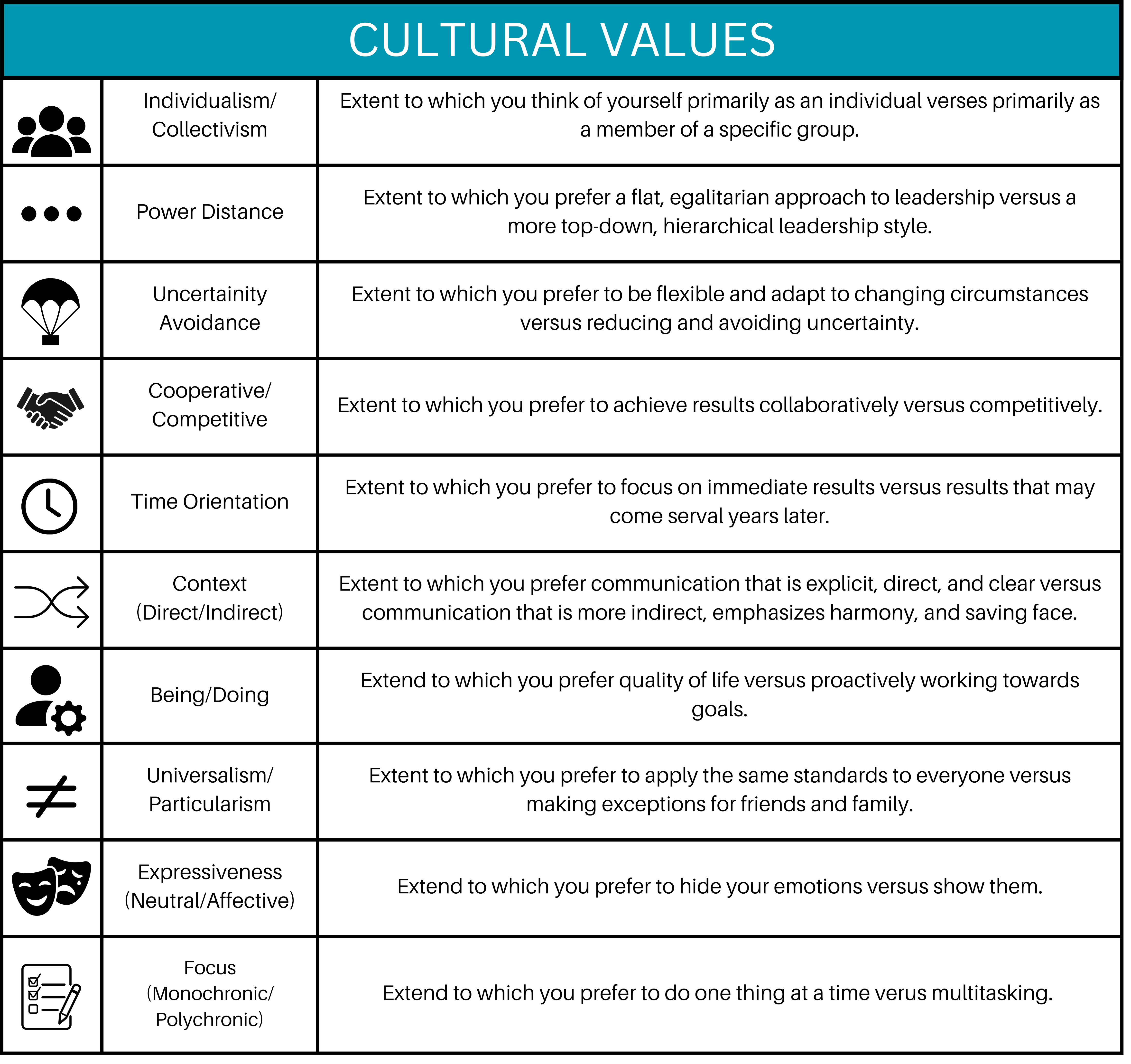 Miscommunication can occur easily when we assume our way is “normal” or “right,” and fail to see the cultural construction of the lens we view life through. For example, some cultures value directness and assertiveness, while others emphasize harmony and indirect feedback. Some rely on strict schedules; others are more flexible with time. These differences can affect everything from project planning meetings to stakeholder engagement processes. Engineers who practice cultural awareness and intelligence can navigate these differences respectfully and productively. Figure 2.14 provides an overview of how different cultural values that can shape how people work together. Note that many of these values are distributed within cultures, and not simply across them; it is important to avoid stereotyping and generalizations while also being sensitive to cultural differences.