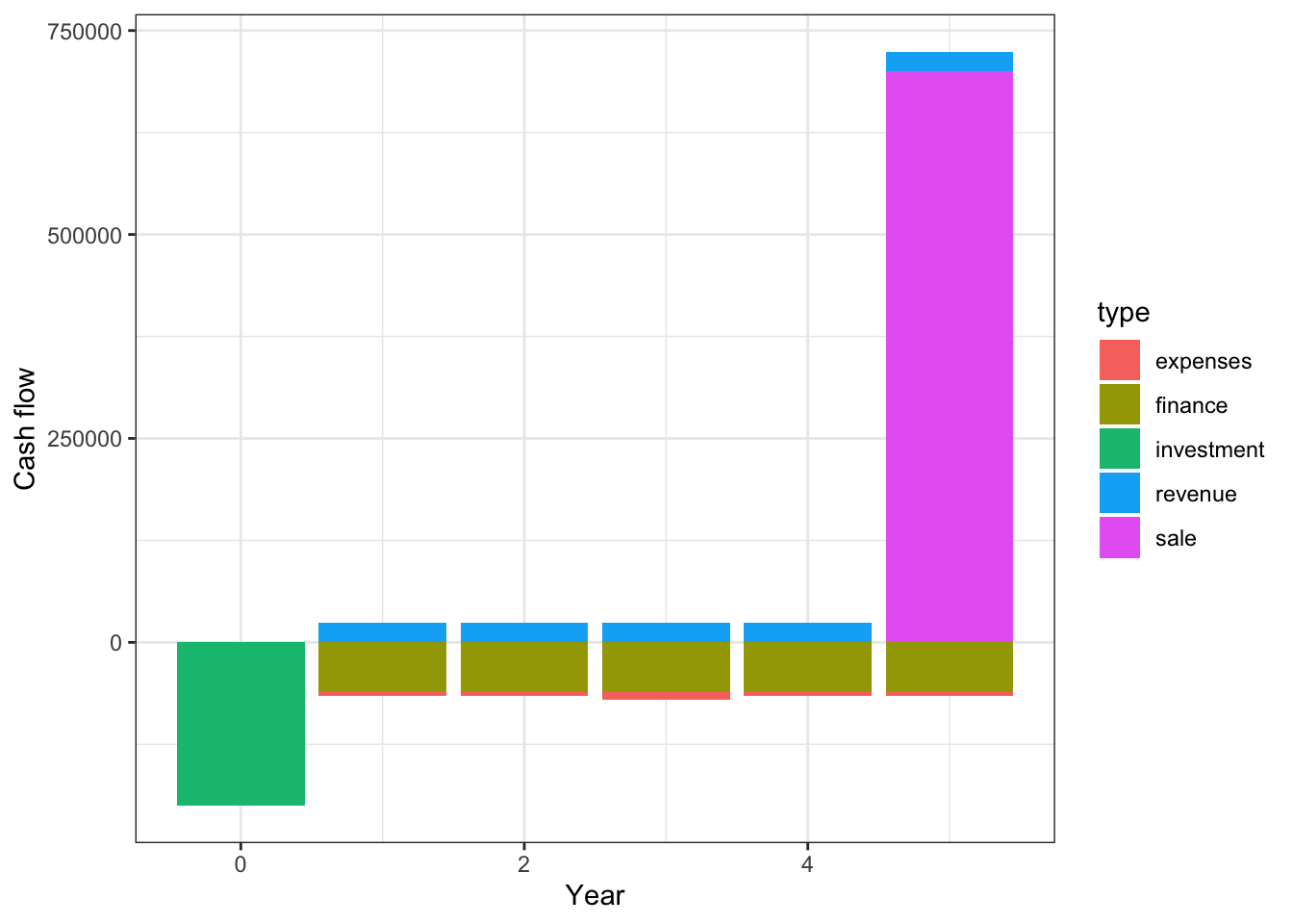 \[ \mathrm{Returns} = \mathrm{Revenue} - \mathrm{Expenses} - \mathrm{Financing} - \mathrm{Taxes} + \mathrm{Sale\ value} - \mathrm{Capital\ investment} \tag{4.1}\]