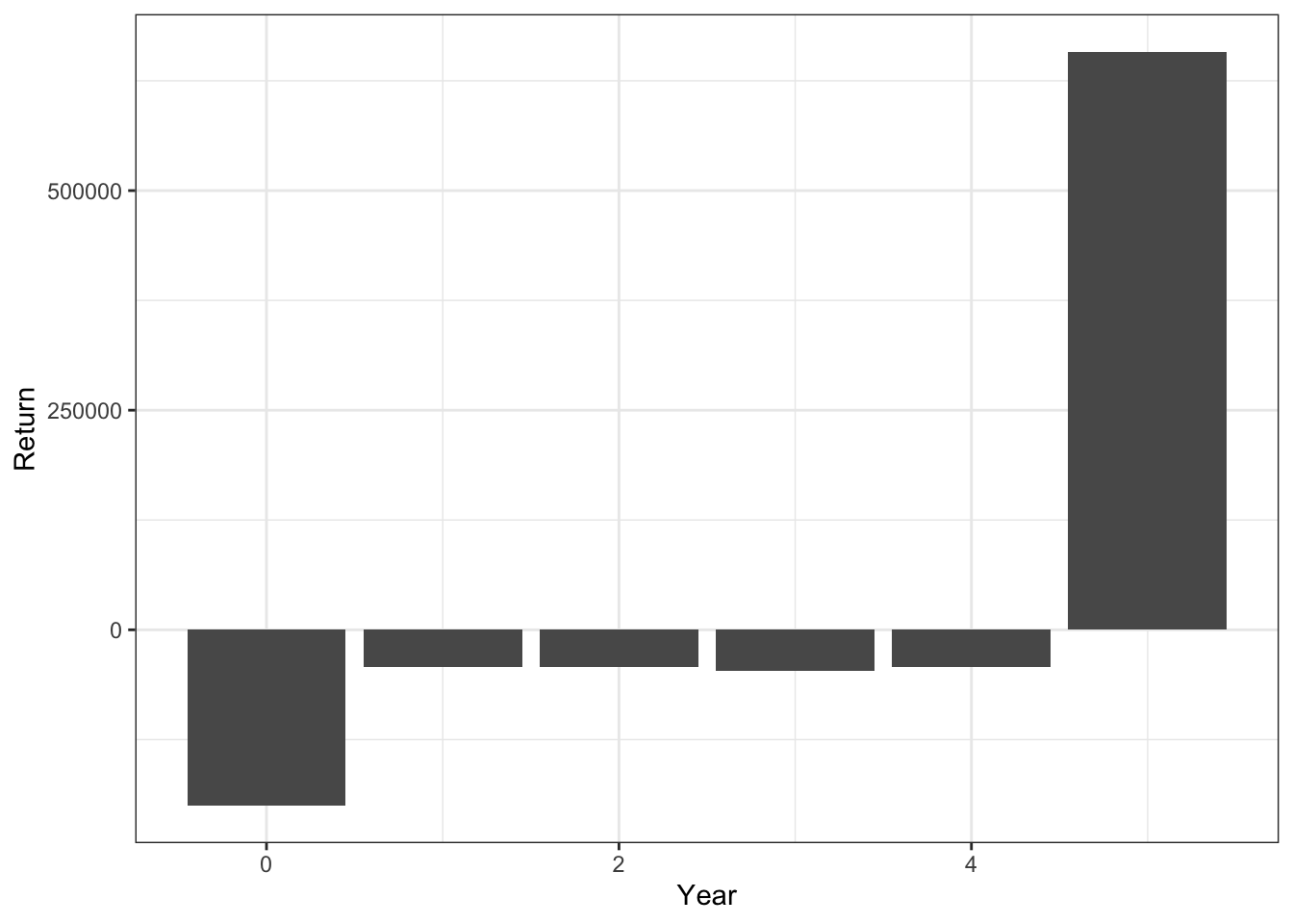 \[\begin{align*} \mathrm{Returns} &= \mathrm{Revenue} - \mathrm{Expenses} - \mathrm{Financing} - \mathrm{Taxes} + \mathrm{Sale\ value} - \mathrm{Capital\ investment}\\ &= 0 - 0 - 0 - 0 + 500000- (400,000 + 80,000)\\ &= 20,000 \end{align*}\]