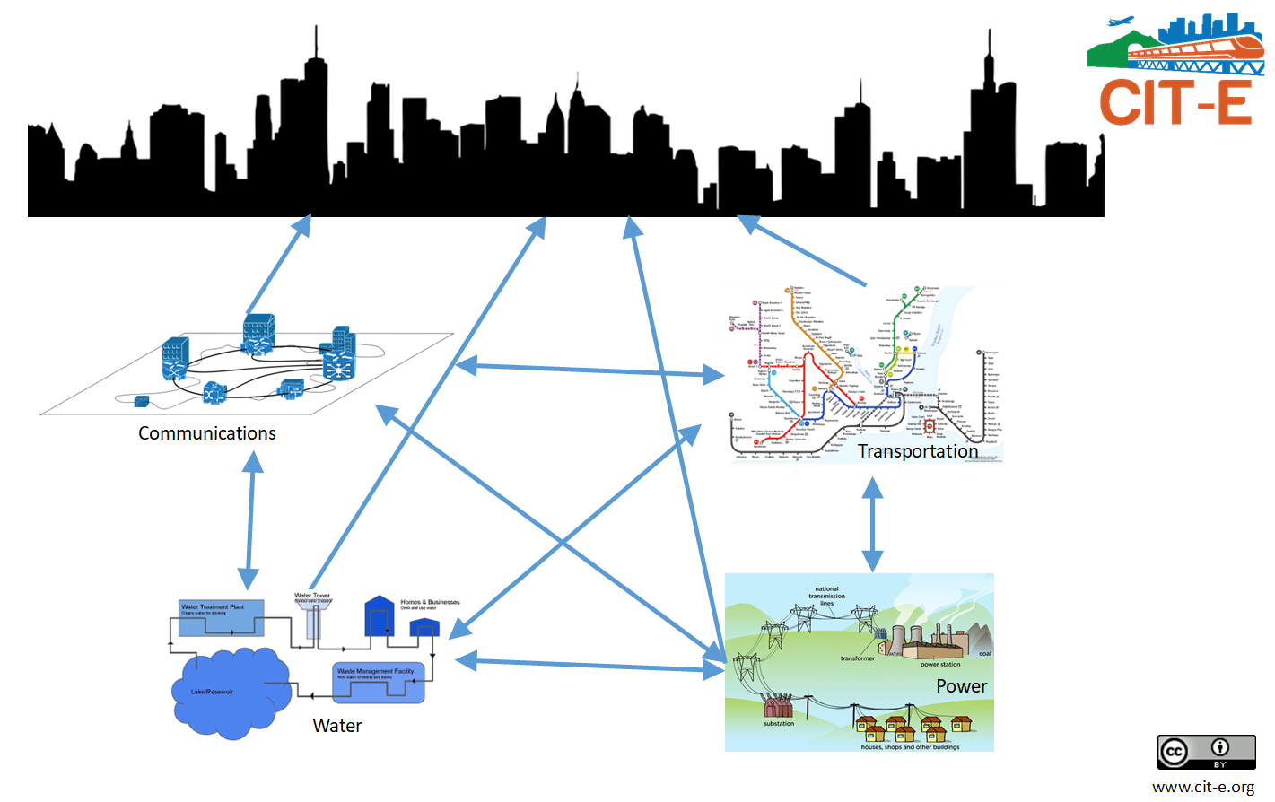Each infrastrucure system is inter-dependent on the other systems. For example, Figure 1.2 shows four infrastructure systems that supports a city. Each of the systems is dependent on the other. The water, electricity, and communication systems are built within the roadway, which connects to the buildings in the city (See Figure 1.2). In turn, the transportation system relies on the communications, power and water system to work correctly. The communication system is needed to coordinate trains and traffic lights, the power system is needed to power the subway trains, traffic, and street lights, and the water system is needed to remove storm water from the subway and roadway. These are just four of the many infrastructure systems at work in a city. The efficiency that is obtained from multiple infrastructure systems working together, permits us to work more productively and live healthy lives or as said above help society function safely and efficiently.