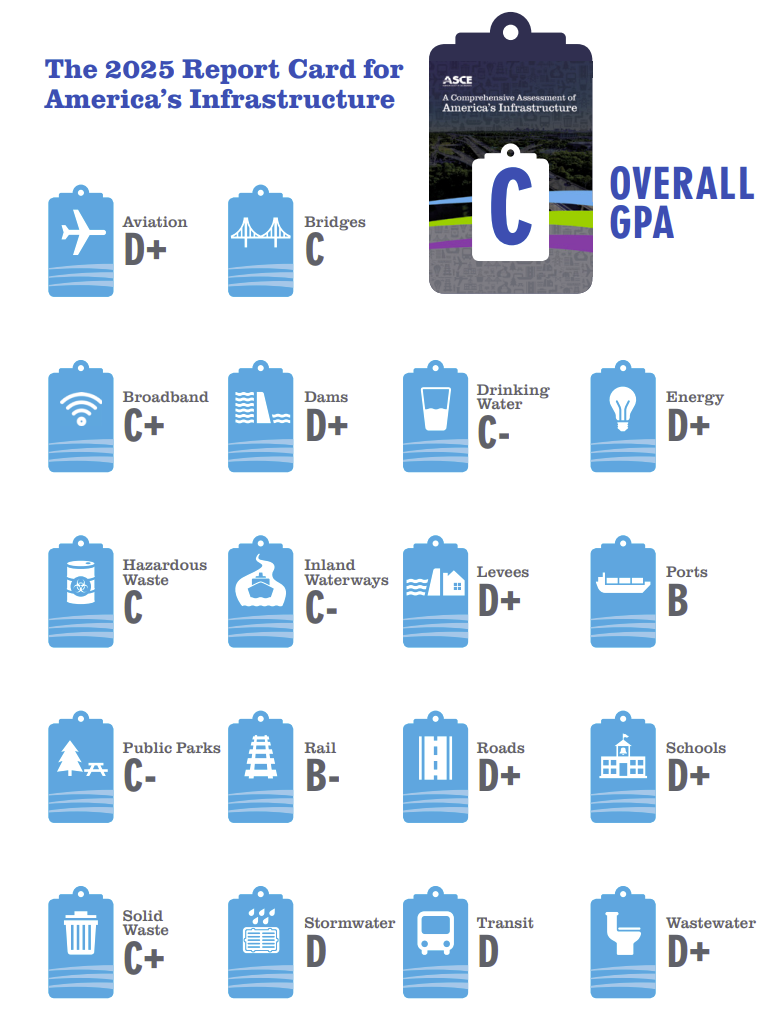 How do we evaluate the quality of the built environment? The American Society of Civil Engineers (ASCE) publishes an Infrastructure Report Card every four years. They rate the US infrastructure using the following criteria: