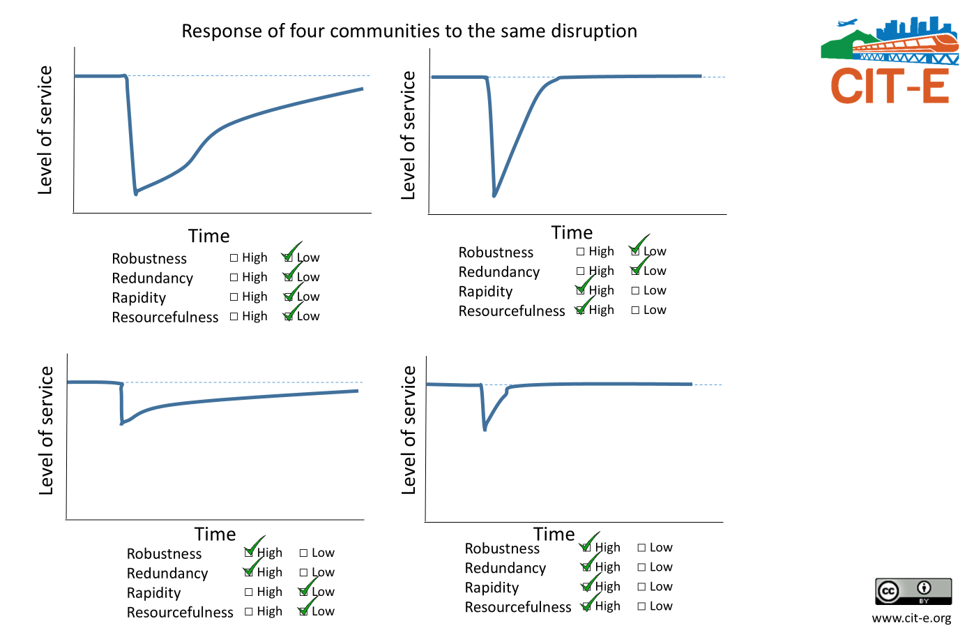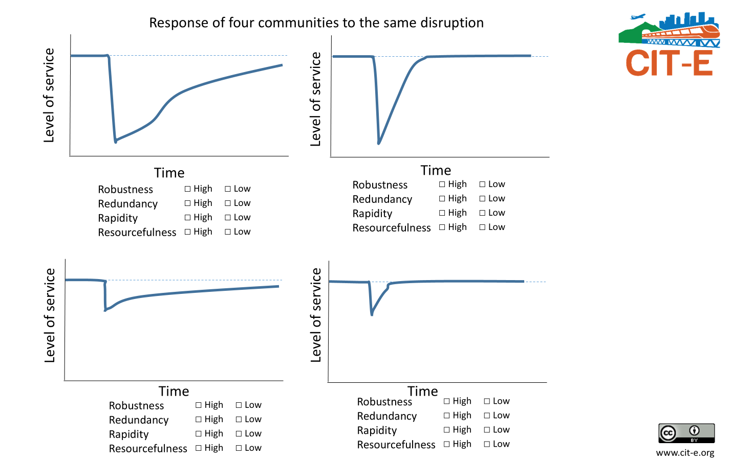 The answer is shown in Figure 1.8. For the community on the top left, all four elements of resilience are comparatively low. The robustness and redundancy was low, as the system lost much of its level of service. It also took a long time to begin to recover from the disruption, implying that its resourcefulness was low. The rate of improvement was also low, implying low rapidity.