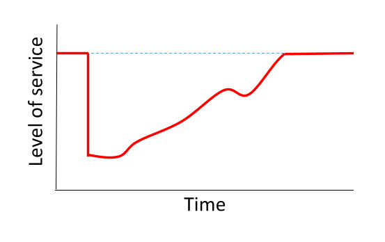 One way to visualize resilience is using a resilience curve. An example resilience curve is shown in Figure 1.5. The resilience curve shows the level of service. The level of service is the quality of the services that infrastructure provides.