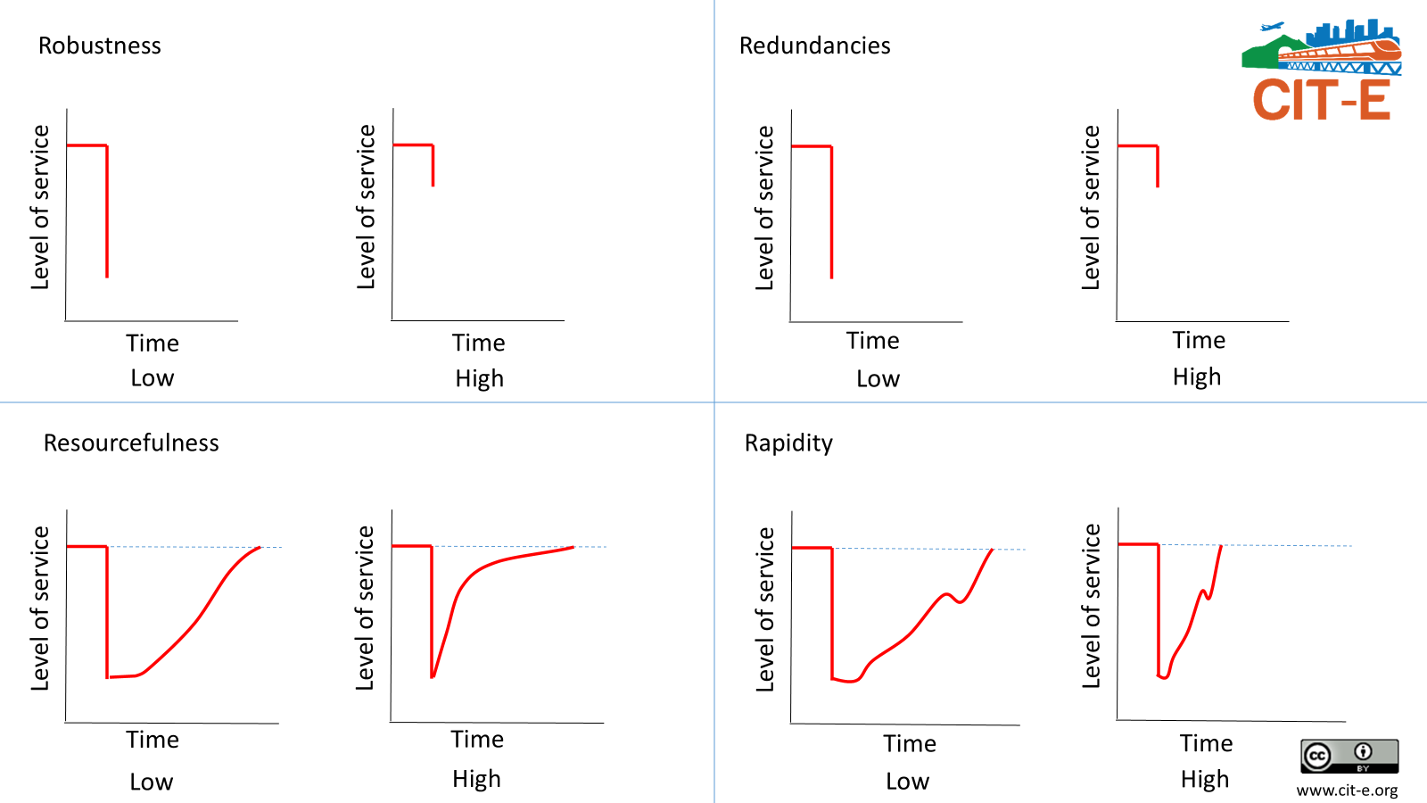 Figure 1.6 shows the impact of the 4 R’s on resilience curves. The robusness and redunancy impact the initial drop in the level of service. The slope or the return to service is impacted by the rapidity and the resourcefulness. A resourceful system will begin to recover more quickly, and a rapid system will have a higher rate of improvement.